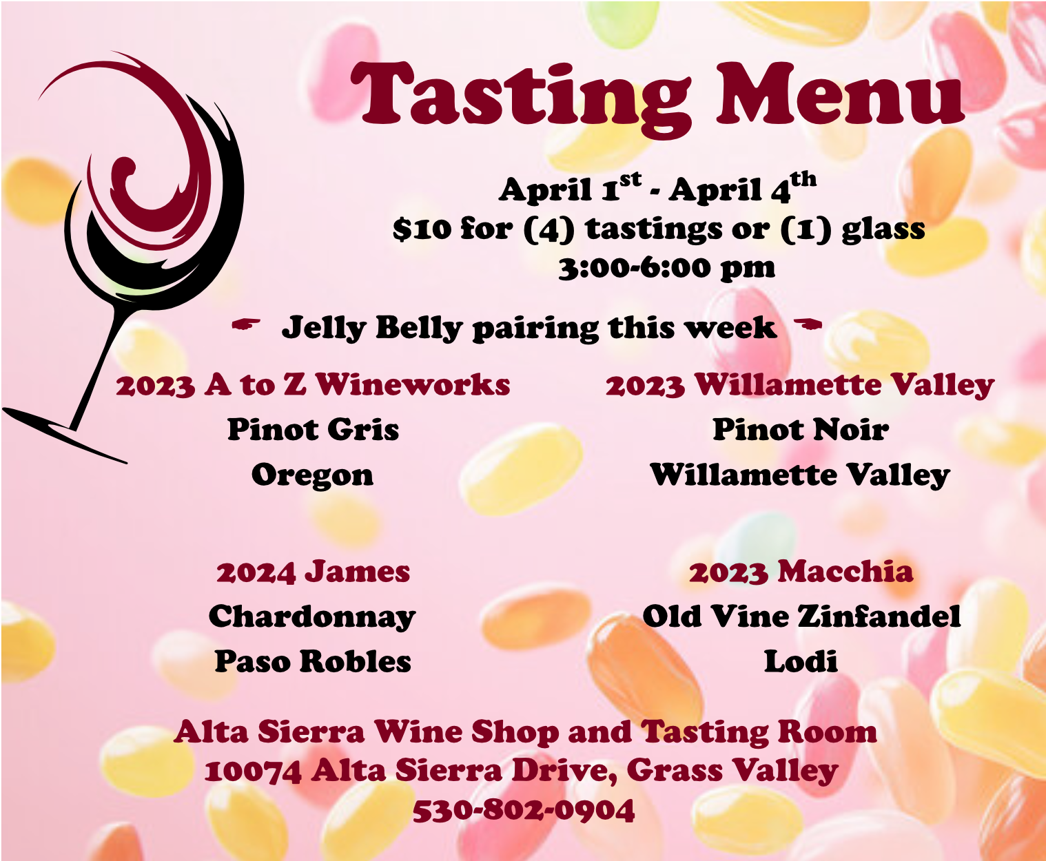 $10 for (4) tastings or (1) glass, $5 for Jelly Belly pairing